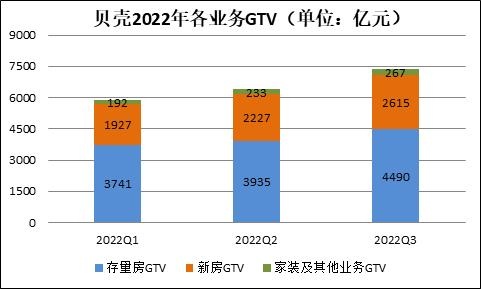 据智通财经APP了解,从业务结构来看,目前贝壳的交易总额(GTV)主要来自四大业务,即存量房交易、新房交易、家装家居和新兴业务部分。2022年三季度,公司各项业务的交易额分别为4490亿元、2615亿元,20亿元、247亿元,其中存量房交易同比增长18.7%,新房交易同比下降36.2%,新兴业务同比下降41.7%,而家装家居业务则成为最大亮点,较去年同期的6600万元呈现出快速增长势头。
