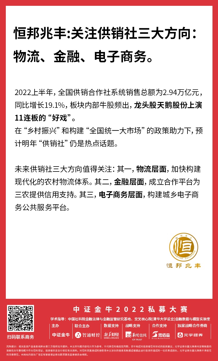 智通财经APP获悉,由元宇证券独家战略支持的中证金牛2022私募大赛于2022年12月1日正式启动,赛事正如火如荼开展。近期不少参赛机构研究团队及产品主理人就市场走势和行业展望发表真知灼见。深圳市恒邦兆丰私募证券基金管理有限公司指出,未来供销社三大方向值得关注:其一,物流层面,加快构建现代化的农村物流体系。其二,金融层面,成立合作平台为三农提供信用支持。其三,电子商务层面,构建城乡电子商务公共服务平台。