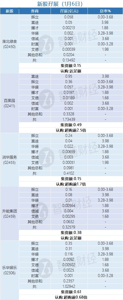 智通财经APP获悉,淮北绿金(02450)、百果园(02411)、润华服务(02455)、升能集团(02459)、乐华娱乐(02306)正在招股中。截至1月6日,辉立、华盛等合计为百果园借出孖展1.73439亿港元,超购逾2.5倍;合计为润华服务借出孖展0.4102亿港元,超购逾1.7倍;合计为乐华娱乐借出孖展1.02942亿港元,超购逾0.68倍;合计为淮北绿金、升能集团借出孖展0.13492港元、0.32579亿港元,认购近足额。