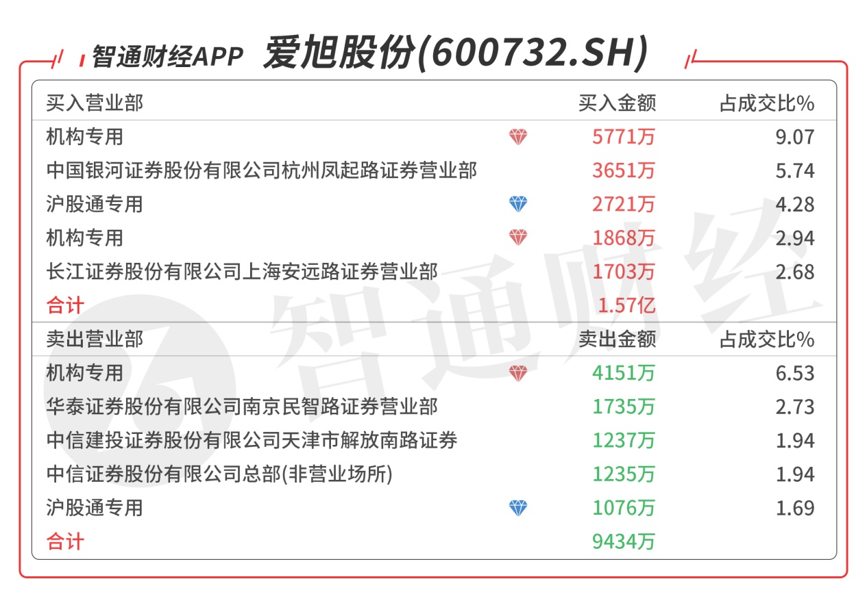 爱旭股份(600732.SH):受到众多机构青睐,今日共3个机构席位出现在龙虎榜单上,对倒合计净买入3489万元,沪股通对倒净买入1646万元,买五是知名游资杭州帮的席位买入3651万元,当日净买入6281万元,该股今日突破所有均线,持续上升需放量。