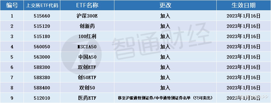 智通财经APP获悉,1月6日,根据港交所最新公告显示,沪深股通名单将进行调整。其中,沪深300E(515660)、创新药(515120)等8只ETF纳入沪股通名单,医药ETF(512010)则被剔除,并转至中华通特别证券名单,即只可卖出;A50ETF(159601)、中国A50ETF(159602)等7只ETF纳入深股通名单。上述名单调整自2023年1月16日起生效。