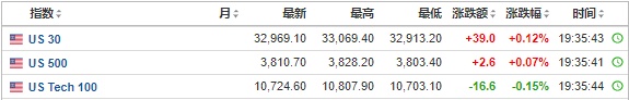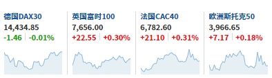 2. 截至发稿,德国DAX指数跌0.01%,英国富时100指数涨0.30%,法国CAC40指数涨0.31%,欧洲斯托克50指数涨0.18%。