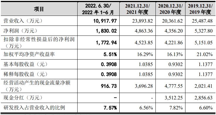 财务方面,于2019年、2020年、2021年及2022年上半年,公司实现营业收入分别约为2.55亿元(人民币,下同)、2.04亿元、2.39亿元及1.09亿元;同期,净利润分别为5327.80万元、4356.20万元、4863.36万元及1830.02万元。