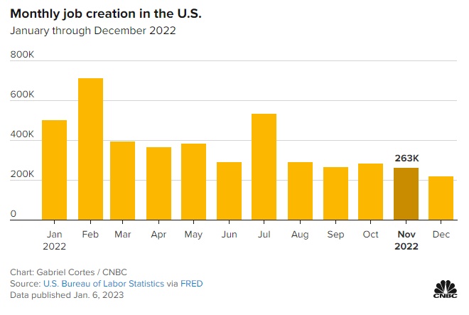 智通财经APP获悉,美国12月就业人数增长有所放缓,但仍超出预期,这表明在美联储试图放缓经济增长之际,就业市场依然强劲。美国劳工部周五公布的数据显示,美国12月非农就业人数增加22.3万人,高于预期的20.2万人,11月就业人数向下修正至增加25.6万人。而失业率降至3.5%,市场预期为3.7%。