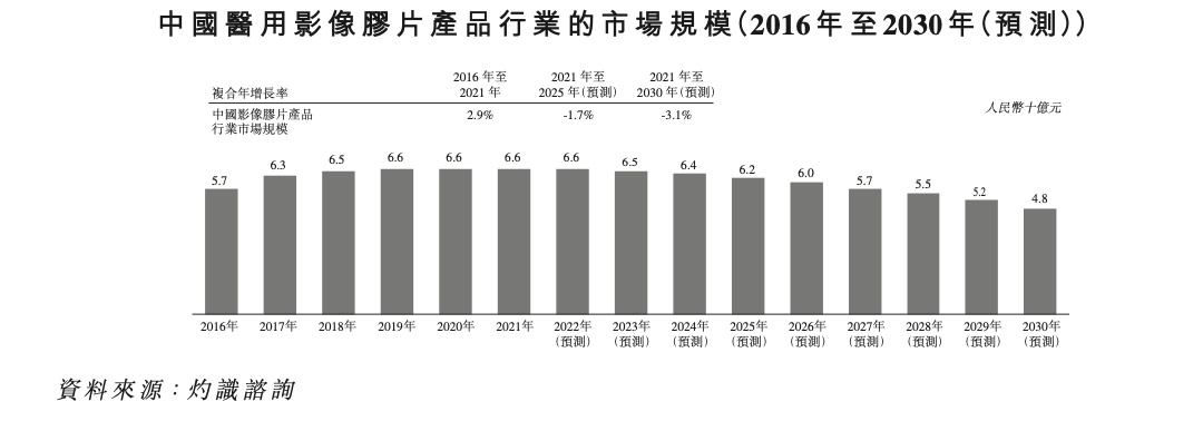 不过值得注意的是,近年来,我国医用影像胶片市场已逐渐饱和,未来几年增速或有所下滑。数据显示,这一行业的市场规模从2016年的57亿元(人民币,下同)增至2019年的66亿元后,行业增长便开始停滞。灼识咨询指出,考虑到医用影像胶片产品是一个相对成熟的市场及使用须医学影像云服务支持的数码医用影像胶片的趋势影像,预期于2030年该市场规模将下滑至48亿元。