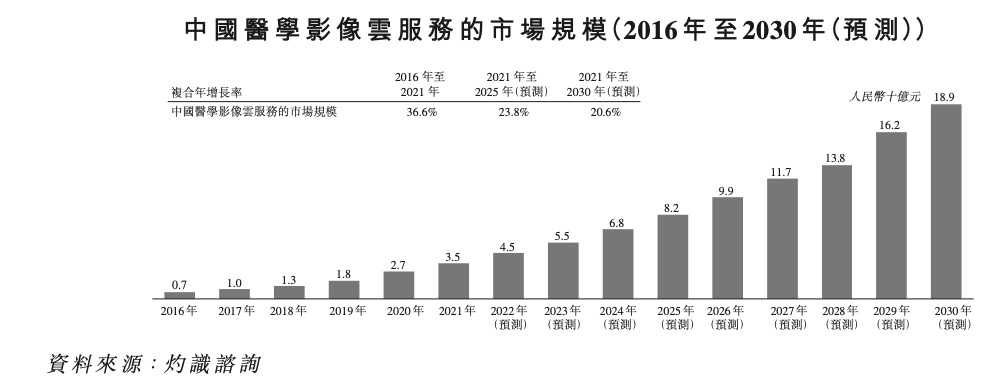 得益于互联网的快速普及和信息技术的快速发展,中国越来越多的医疗机构正在部署医学影像云服务以提高效率并方便影像阅读,这带动相关市场规模从2016年的7亿元持续增长至2021年35亿元,复合年增长率高达36.6%。随着影像设备改进和影像量的显著增加带来更大存储容量的需求,云平台已成为比传统本地存储更具成本效益的方式。连同区域内及机构间共享资料及数据的需求,预计中国医学影像云服务行业的市场规模将从2021年的35亿元进一步增长至2030年的189亿元,复合年增长率为20.6%。