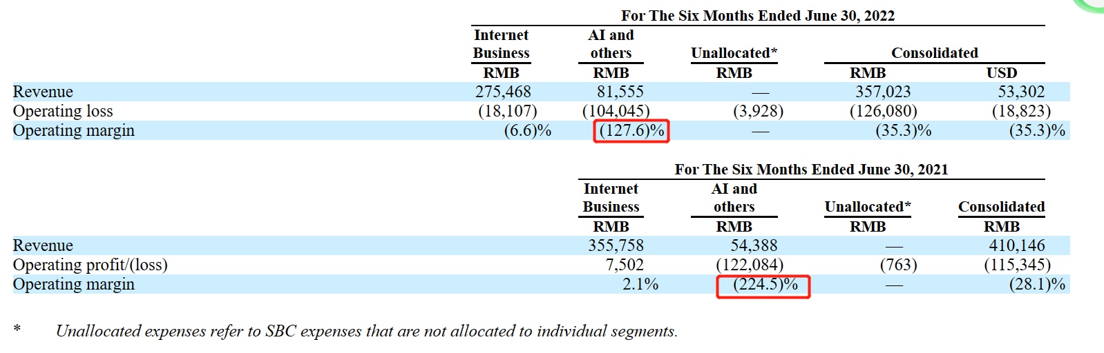 在人工智能及其他收入大增50%后,规模效应在财报中得以显现。智通财经APP发现,2022年上半年时,该板块的营业利润率已从2021年同期的-224.5%大幅改善至-127.6%,这意味着人工智能及其他板块的亏损有明显缩窄,但距离盈亏平衡仍有较远距离。