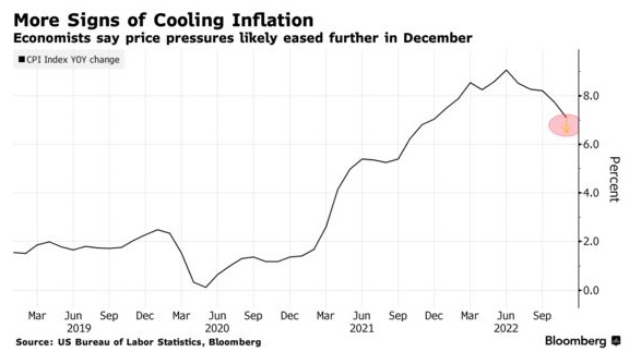 本周投资者将得到最新的通胀数据,届时情况可能会更加明朗。对12位经济学家的调查预计,12月CPI将上涨6.5%,低于6月份9.1%的水平。密歇根大学对美国消费者的调查显示,上个月,未来一年的通胀预期降至2021年6月以来的最低水平。