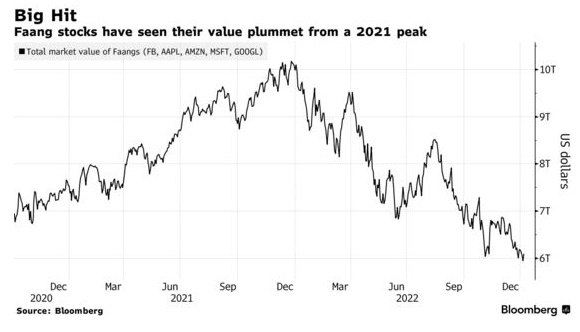 在过去十年的大部分时间里,科技巨头推动了股市的牛市。在新冠疫情期间,投资者对所有数字产品如饥如渴,它们也占据了主导地位。然而,这一趋势在去年发生逆转。随着利率攀升和2022年增长前景恶化,科技巨头FAANG市值下跌了38%,落后于纳斯达克100指数和标准普尔500指数。