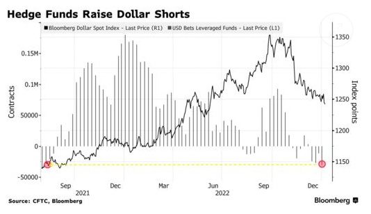 智通财经APP获悉,对冲基金越来越看空美元,凸显了美联储可能会放慢加息步伐的猜测。根据对美国商品期货交易委员会汇编的关于8种货币对的数据显示,上周做空美元的押注增至30457份合约,为2021年8月以来的最高水平。掉期合约显示,投资者目前预计美国政策利率将在5%以下达到峰值,低于上周五数据显示美国12月工资增长放缓后的5.06%。