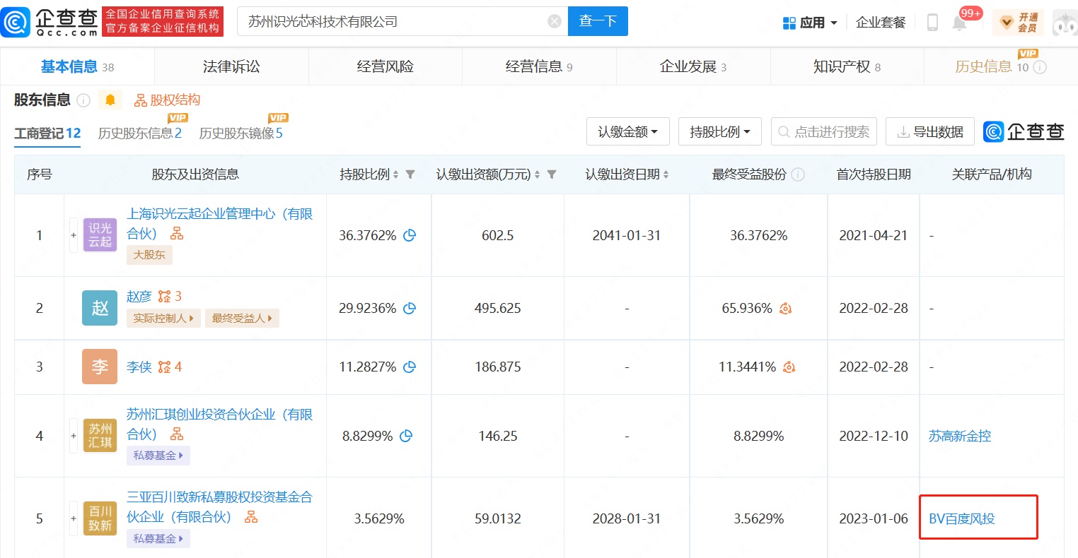 智通财经APP获悉,企查查APP显示,近日,苏州识光芯科技术有限公司(下称:识光芯科)发生工商变更,新增股东为百度关联公司三亚百川致新私募股权投资基金合伙企业(有限合伙)等。据公开资料显示,识光芯科成立于2021年4月,是一家激光雷达芯片制造商。致力于用芯片重新定义激光雷达,为自动驾驶、机器人、元宇宙等终端应用市场提供基于单光子(SPAD)检测技术的dToF三维感知解决方案。