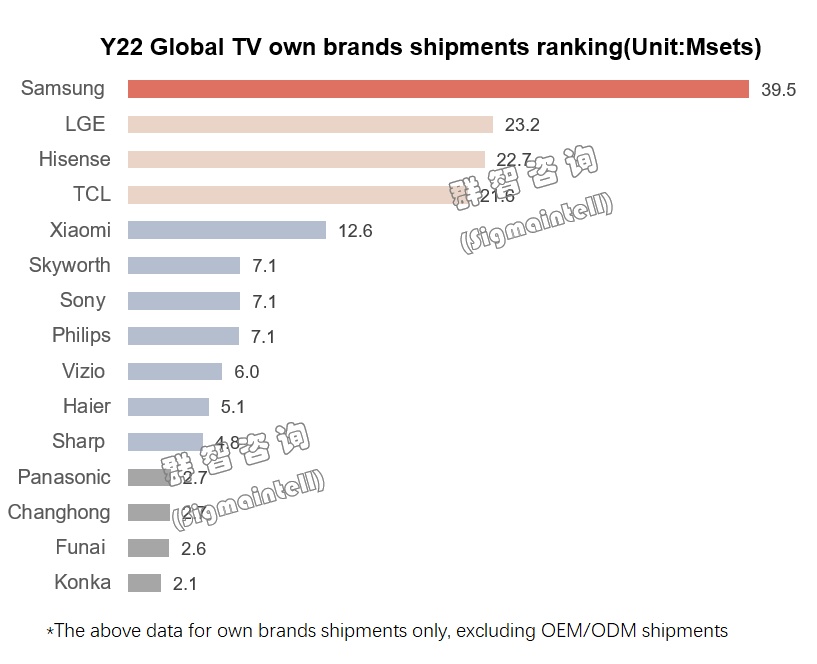 第三梯队则是以小米领衔的一众品牌,包括创维、索尼等分别占据全球电视品牌排行榜的第4-第10位。