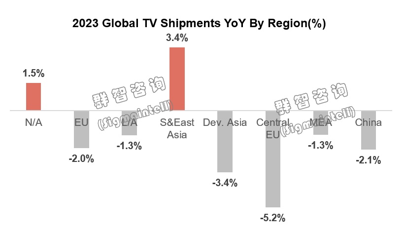 伴随着控通胀压力持续,2023年全球各个区域的经济恢复面临不同的阻力,电视需求将呈现区域分化的特点。群智咨询预计,北美和东南亚市场在经济增长支撑和成本下降的驱动下,2023年电视需求有望迎同比增长,而其他区域则依然受宏观经济的拖累,需求恐难恢复增长。