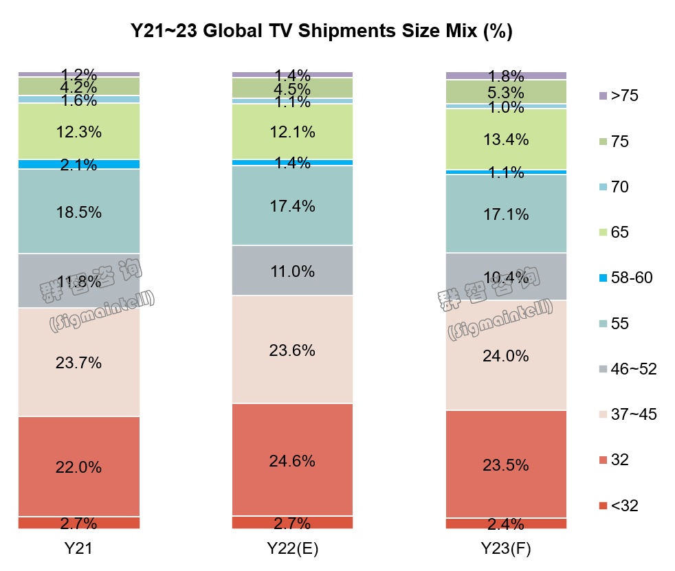2. 成本和产品细分化驱动,2023年65“+超大尺寸市场需求将由颓转盛