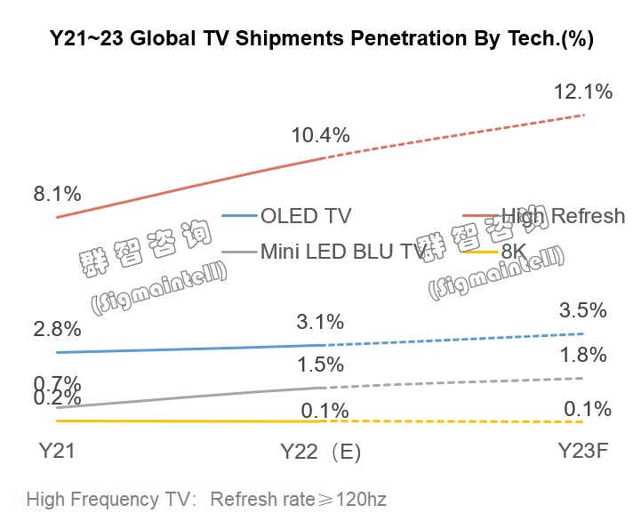 首先高刷电视High frequency TV,从用户群来看,高刷电视可覆盖的人群更为年轻化,特别是从IT设备中吸引来的跨品类用户。从产品体验来看,给消费者带来更好的观看体验,尤其是在观看体育赛事、电影大片和玩游戏的体验中,可以带来更稳定和更清晰的显示画面。从成本和价差来看,随着材料成本下降,60hz和120hz电视的整体成本未来有望进一步缩小,因此,群智咨询认为,高刷电视存在普及化的潜力。群智咨询统计数据显示,全球TV市场中,高刷电视2022年的渗透率已超10%,预计2023年将达到12.1%。