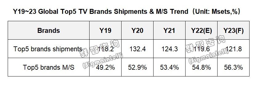相较于其他消费电子市场,尽管全球TV市场品牌集中度偏低,但近年来也呈现集中度提升的趋势,表现在头部品牌的市场份额呈现持续提升,而其他品牌的品牌力则逐步走弱。群智咨询统计数据显示,全球Top5电视品牌的市场份额由疫情前的低于50%,2022年达到54.8%,预计2023年将进一步提升到56.3%。