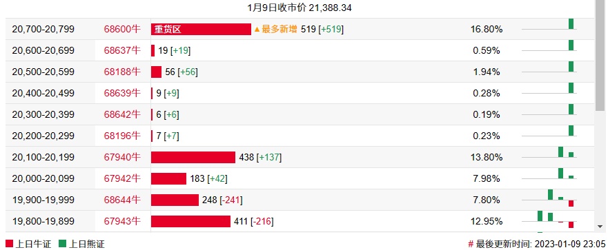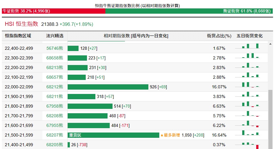 法兴恒指牛熊证街货分布图中的数据显示,熊证街货重货区在21500-21599区间,该区间最新熊证数量为1050张,较上一交易日增加208张;最多新增在同一区间。