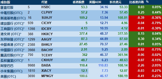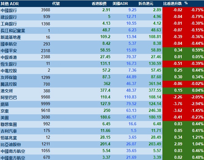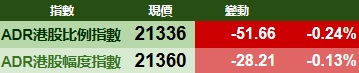 智通财经APP获悉,周一美股三大指数涨跌不一,港股ADR指数下跌,按比例计算,收报21336点,较香港收市跌51.66点或0.24%。
