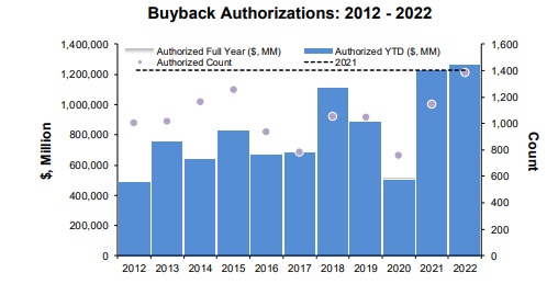 因此,在2022年,不断上升的经济衰退威胁似乎没有阻止美国公司在股票回购上投入大量的资金。随着企业为应对经济放缓而紧缩开支,从广告到差旅和招聘等方方面面都在削减成本,继续承诺回购股票可以在一定程度上抵消华尔街的悲观情绪。