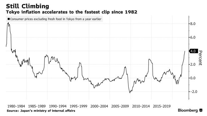 智通财经APP获悉,根据最新数据显示,日本东京的通货膨胀率自1982年以来首次达到4%,同时有迹象显示,物价的加速上涨在一定程度上抑制了家庭支出。日本内务省周二表示,12月东京不含生鲜食品的核心CPI同比上涨了4%,高于经济学家预期的3.8%。
