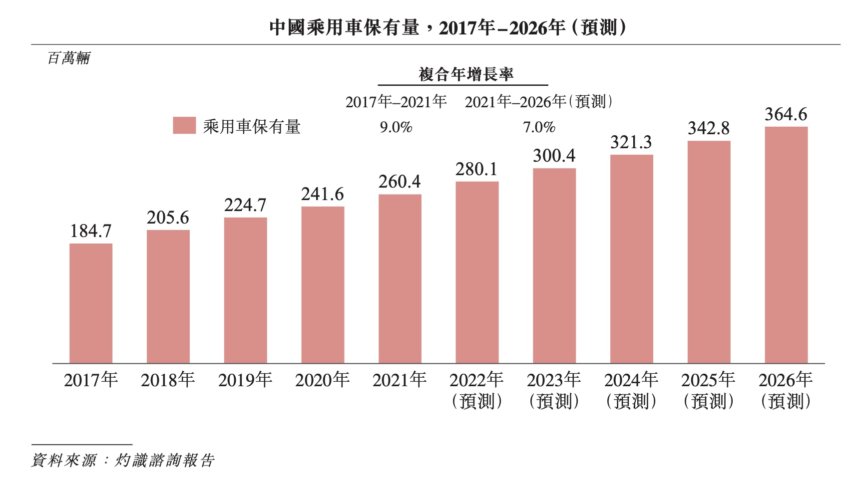 据智通财经APP了解,按乘用车保有量计,中国已成为世界第一大汽车市场,截至2021年底,中国乘用车保有量已达2.6亿辆。然而,每千人乘用车保有量仅为184辆,远低于美国及欧盟成员国等发达国家,呈现出巨大的增长空间。根据灼识咨询报告,中国已连续超过10年蝉联全球新车销量第一。预计中国的乘用车保有量预计将继续保持增长势头,到2026年更将进一步达到3.64亿辆。