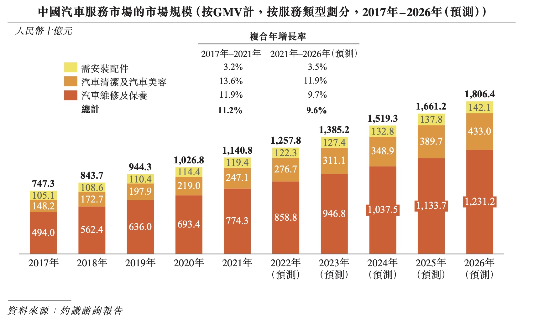 受庞大并持续增长的汽车保有量及日渐增长的车龄推动,中国汽车服务市场保持高速增长,从2017年的7473亿元增长至2021年的1.14万亿元,年复合年增长率高达11.2%,已成为全球汽车服务市场增长最快的国家之一。按GMV计,预计到2026 年中国汽车服务市场规模将达到1.8万亿元,复合年增长率为9.6%。