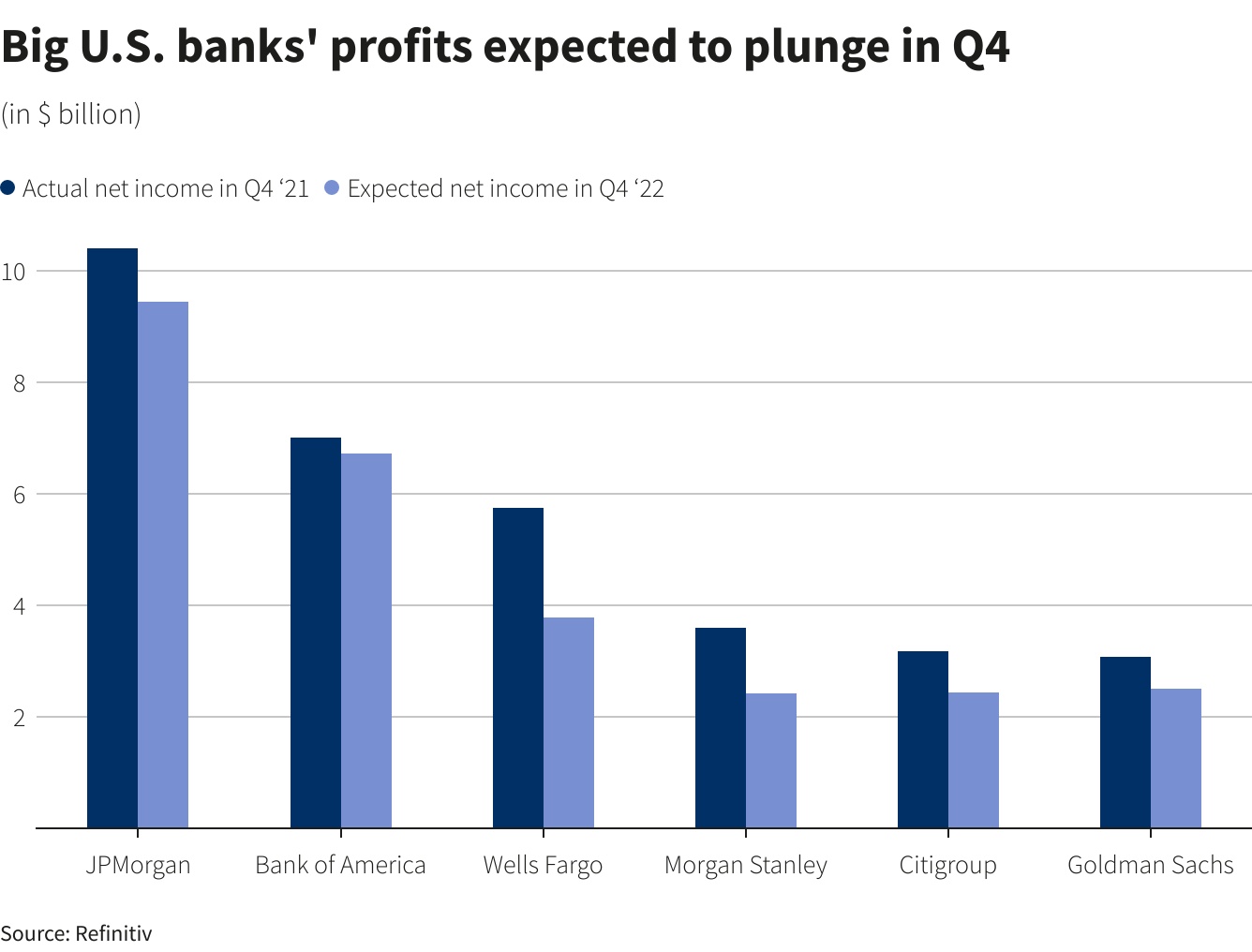 美联储仍在收紧货币政策以抗击数十年来最高水平的通胀。物价上涨和借贷成本上升导致消费者和企业削减支出,当经济活动放缓时,作为经济中间商的银行的利润就会下降。Refinitiv的初步分析显示,上述六家银行第四季度的净利润预计将平均较上年同期下降17%。不过,银行等贷款机构仍有望从利率上升中获益,因为利率上升使它们能够向借款人收取更多利息。