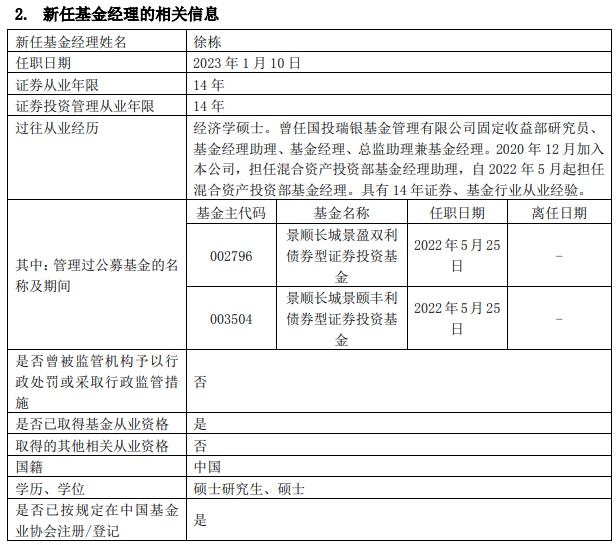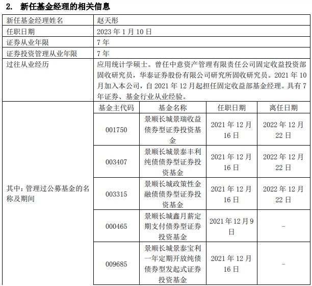 同日,景顺长城景泰优利一年定开债券(010527)发布公告,增聘赵天彤为基金经理,任职日期自2023年1月10日起。此外,陈健宾不再担任该基金基金经理,离任日期为2023年1月10日。截止2023年1月9日,景顺长城景泰优利一年定开债券净值为1.0435,较上一日下跌0.06%,近一年上涨2.71%。