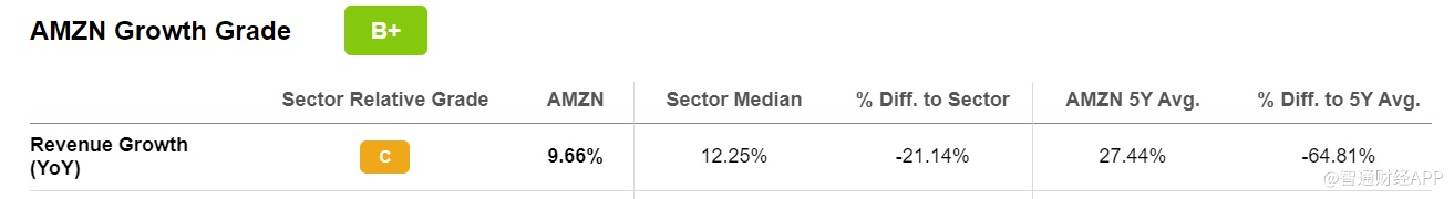围绕亚马逊盈利能力不足的担忧因其增长急剧放缓而加剧。值得注意的是,亚马逊的营收同比增速现在已经低于行业中值。这里与亚马逊进行对比的是非必需消费品行业,而不是包括网络安全和数据分析等高增长领域的科技行业。