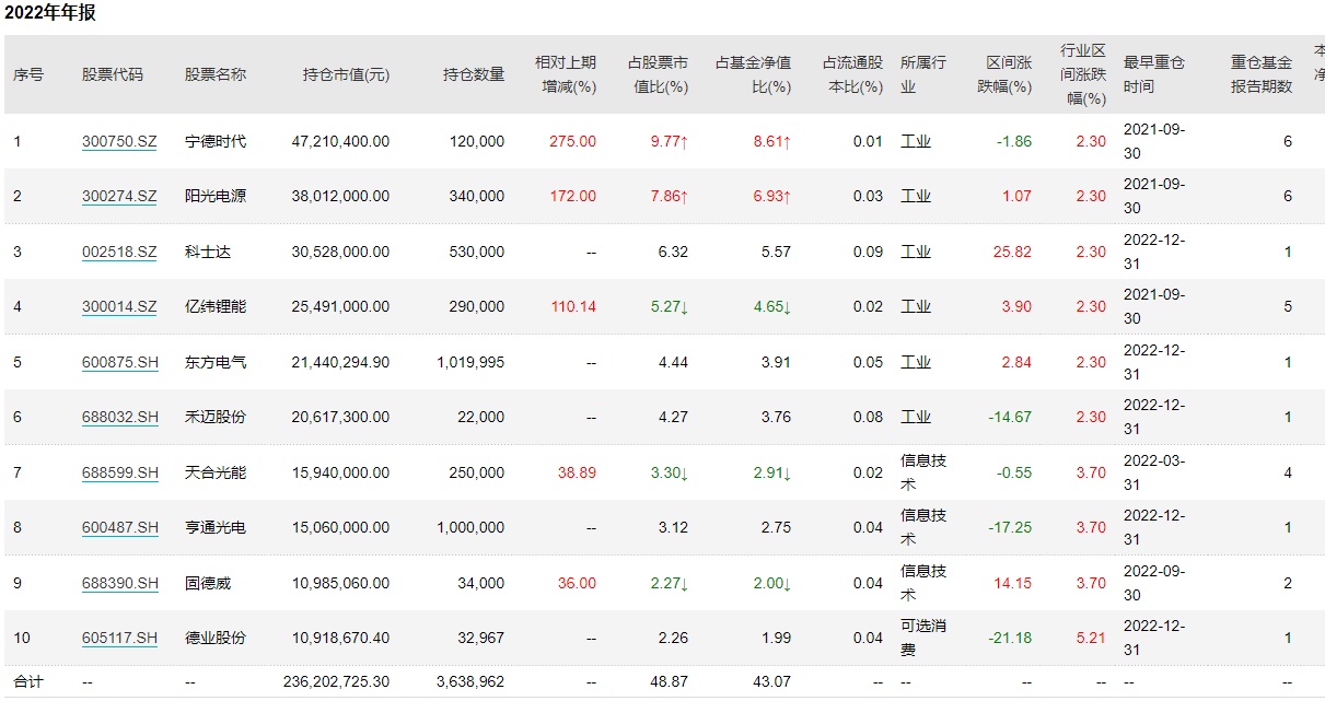 四季报数据显示,该基金前十大重仓股分别为宁德时代(300750.SZ)、阳光电源(300274.SZ)、科士达(002518.SZ)、亿纬锂能(300014.SZ)、东方电气(600875.SH)、禾迈股份(688032.SH)、天合光能(688599.SH)、亨通光电(600487.SH)、固德威(688390.SH)、德业股份(605117.SH)。