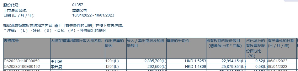 智通财经APP获悉,香港联交所最新资料显示,1月5、6日,公司非执行董事李开复分别减持美图公司(01357)29.25万股、288.57万股,合计317.82万股,每股作价分别为1.4809港元、1.5253港元,总金额约为483.47万港元。减持后最新持股数目约为2299.42万股,最新持股比例为0.52%。