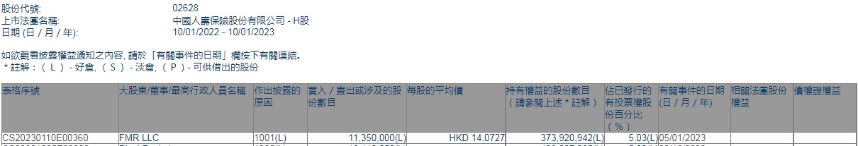 智通财经APP获悉,香港联交所最新资料显示,1月5日,FMR LLC增持中国人寿(02628)1135万股,每股作价14.0727港元,总金额约为1.60亿港元。增持后最新持股数目约为3.74亿股,最新持股比例为5.03%。
