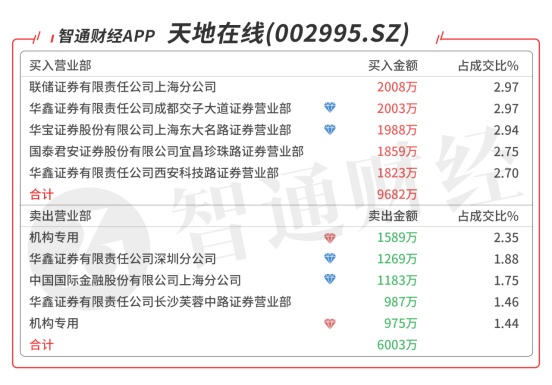 天地在线(002995.SZ):多主力现身龙虎榜,机构与游资出现分歧,机构席位对倒卖出2319万元,买二是知名游资的席位买入2003万元,买三是知名游资的席位买入1962万元,当日净买入4417万元,该股今日强势反包,预计有溢价。