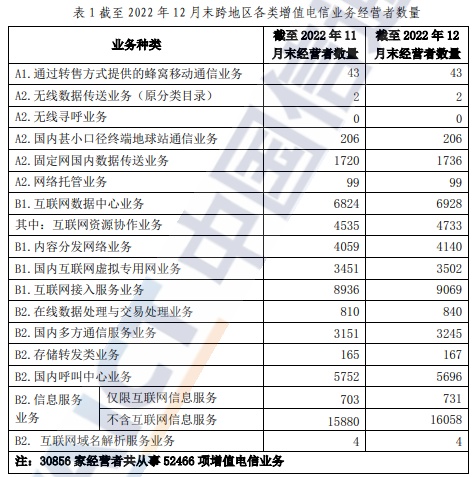 从各业务跨地区经营者数量来看,排名前三的业务依次是:16058家企业经营信息服务业务(不含互联网信息服务),9069家企业经营互联网接入服务业务,6928家企业经营互联网数据中心业务,详见下表。