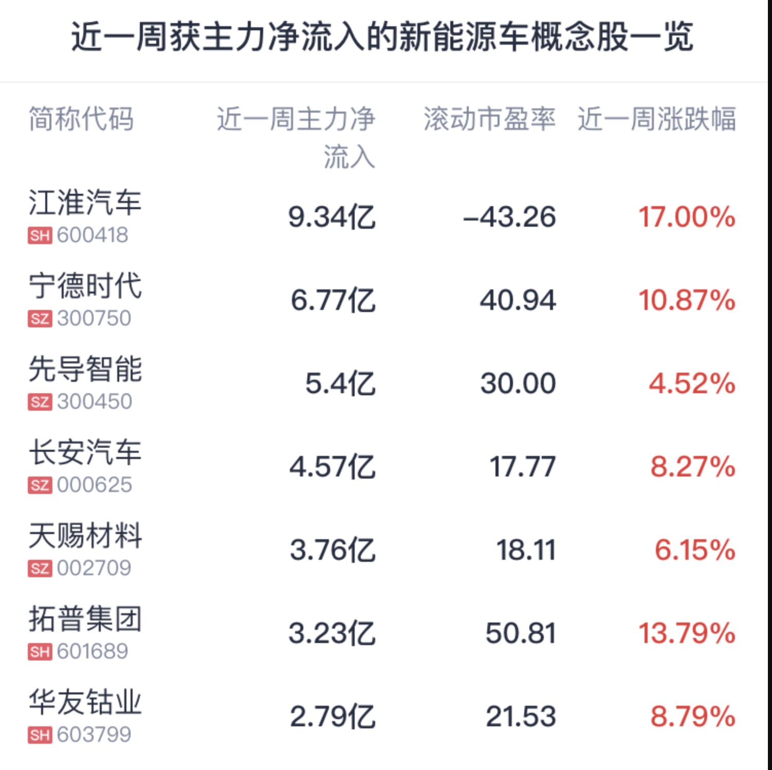 腾讯自选股统计了近一周主力资金净流入靠前的新能源车概念股,仅供读者参考。数据显示,近一周江淮汽车、宁德时代、先导智能等获主力资金净流入靠前,均获主力净流入超5亿元。