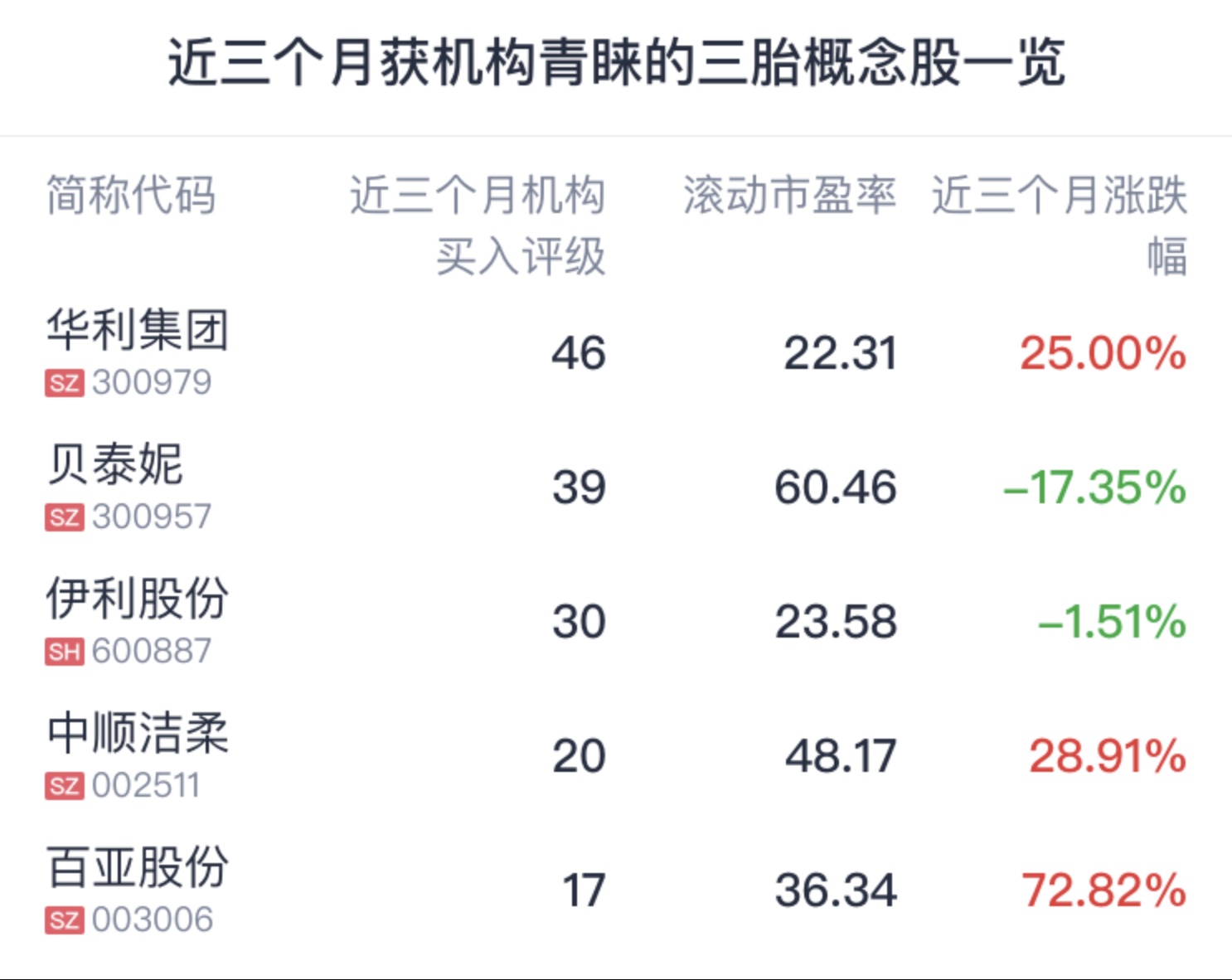 腾讯自选股统计了近三个月获机构青睐的三胎概念股名单,仅供读者参考。数据显示,近三个月华利集团获46家机构买入评级居首,其次的贝泰妮、伊利股份均获机构买入评级超30家。