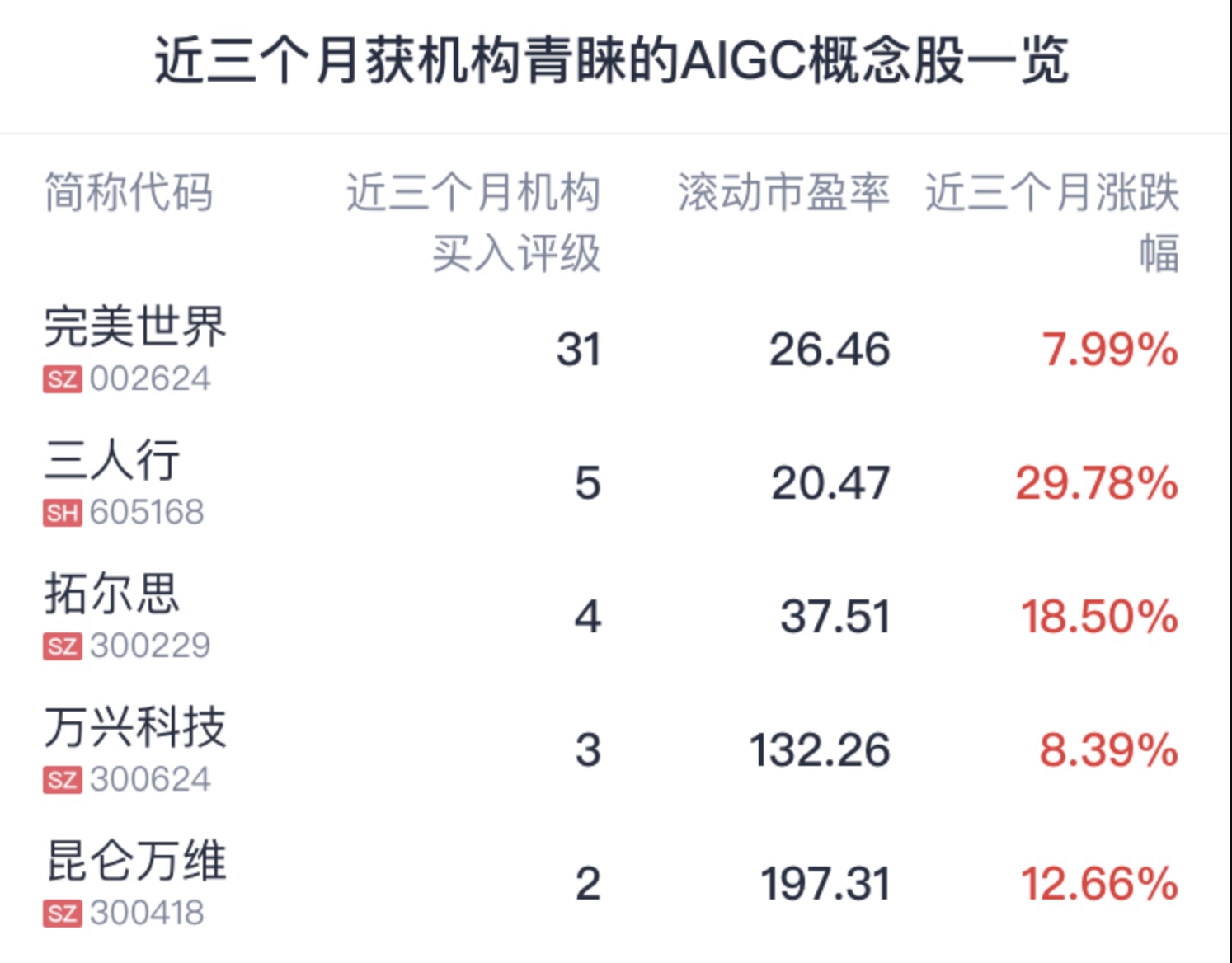 腾讯自选股统计了近三个月获机构青睐的AIGC概念股名单,仅供读者参考。数据显示,近三个月三人行、拓尔思、万兴科技等获机构买入评级靠前,均获机构买入评级超3家。