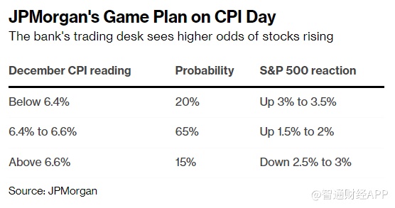 虽然市场普遍预计去年12月的消费者价格指数(CPI)将下滑至6.5%,包括Andrew Tyler在内的摩根大通团队认为,12月CPI数据有三分之二的可能性与预估值相差10个基点以内,且会比预估值低。他们认为,由于投资者基本上处于防御状态,任何表明美联储的抗通胀行动正在奏效的证据都将引发人们急于解除看跌头寸。在这种情况下,他们认为,标普500指数会在交易时段上涨1.5%-2%。