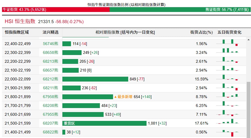 法兴恒指牛熊证街货分布图中的数据显示,熊证街货重货区在21500-21599区间,该区间最新熊证数量为1081张,较上一交易日增加32张;最多新增在21800-21899区间,该区间最新熊证数量为654张,较上一交易日增加140张。