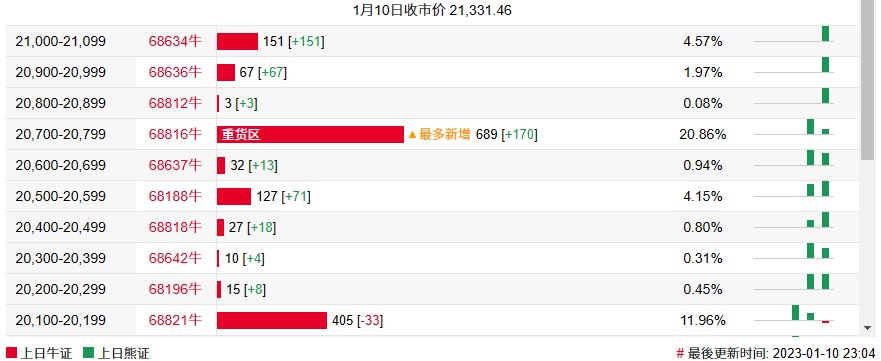 牛证街货重货区在20700-20799区间,该区间最新牛证数量为689张,较上一交易日增加170张;最多新增在同一区间。