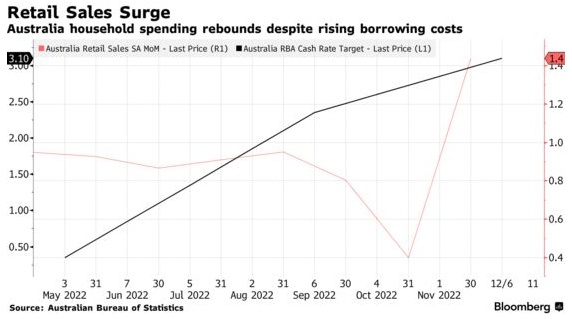 数据公布后,澳元上涨0.3%至1澳元兑69.07美分,三年期政府债券收益率上涨,因为澳洲联储的政策制定者表示,未来的加息将取决于即将发布的通胀和就业数据。利率制定委员会将于2月7日举行2023年的第一次会议。