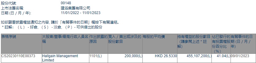 智通财经APP获悉,香港联交所最新资料显示,1月9日,Hallgain Management Limited增持建滔集团(00148)20万股,每股作价26.5330港元,总金额为530.66万港元。增持后最新持股数目约为4.55亿股,最新持股比例为41.04%。