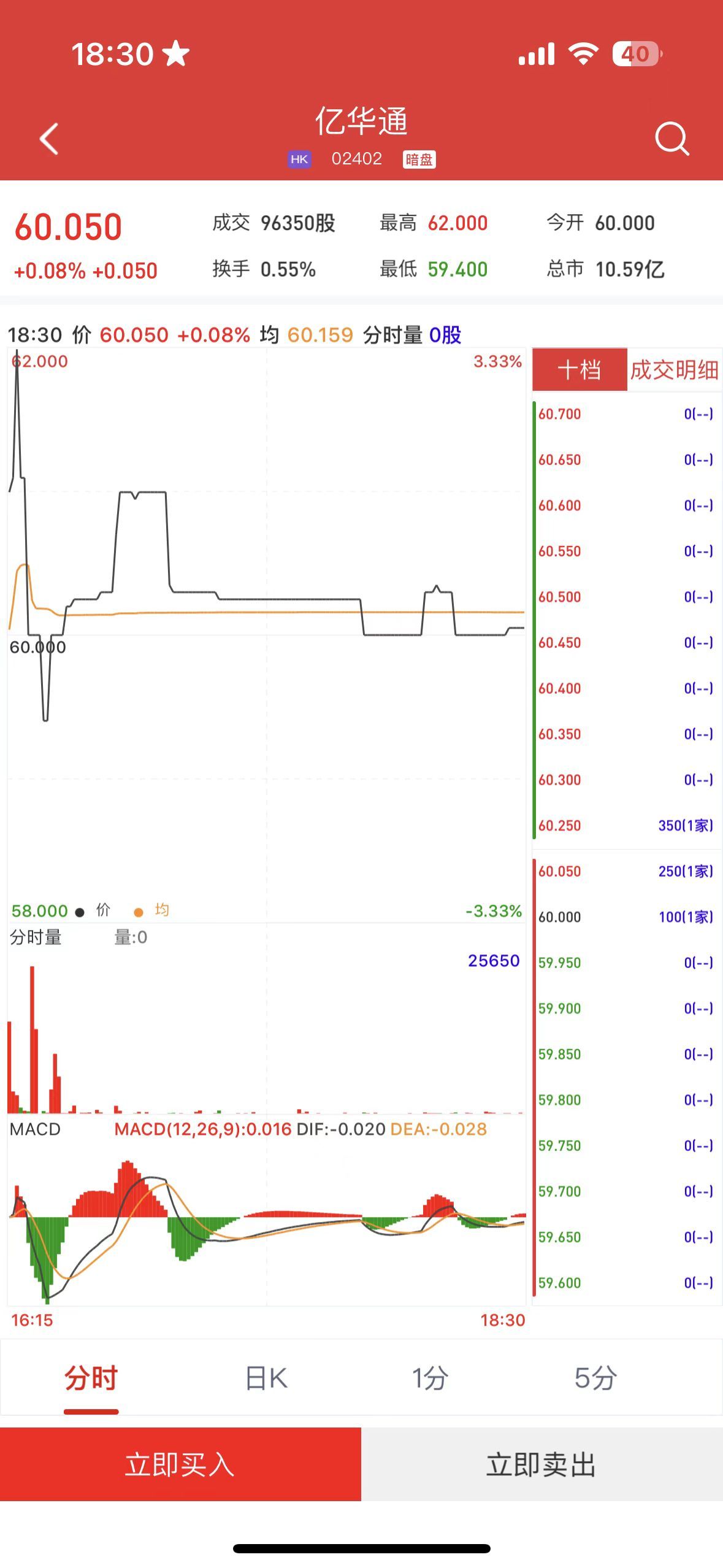 智通财经APP获悉,亿华通(02402)将于1月12日(周四)在香港挂牌。截至收盘,利弗莫尔证券暗盘交易显示报价60.050港元,较招股价60港元涨0.08%。每手50股,不计手续费,每手赚2.5港元。