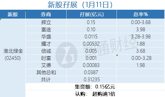 智通财经APP获悉,淮北绿金(02450)、乐华娱乐(02306)正在招股中。截至1月11日,辉立、华盛等合计为淮北绿金借出孖展