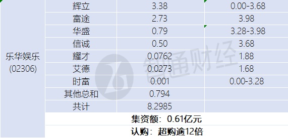 0.31235亿港元,超购逾1倍;合计为乐华娱乐借出孖展8.2985亿港元,超购逾12倍。