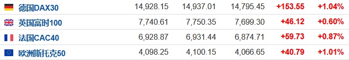 2. 截至发稿,德国DAX指数涨1.04%,英国富时100指数涨0.60%,法国CAC40指数涨0.87%,欧洲斯托克50指数涨1.01%。