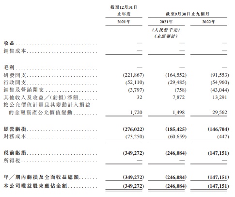 于往绩纪录期间,公司产生大额研发开支、行政开支以及销售及营销开支,因此于截至2021年12月31日止年度及截至2022年9月30日止九个月录得亏损净额分别人民币3.493亿元及人民币1.472亿元人民币。