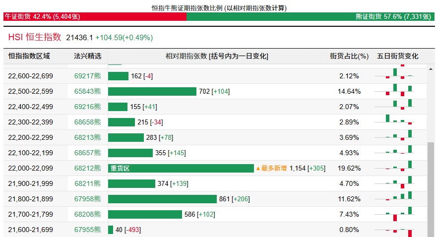 法兴恒指牛熊证街货分布图中的数据显示,熊证街货重货区在22000-22099区间,该区间最新熊证数量为1154张,较上一交易日增加305张;最多新增在同一区间。