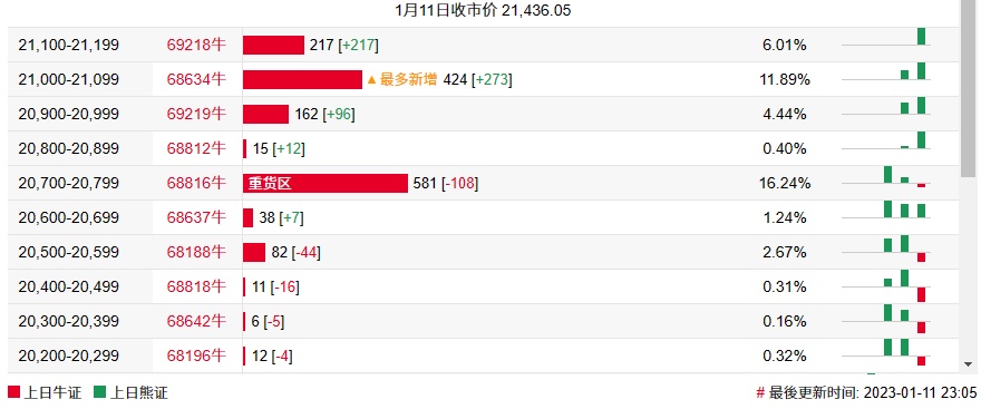 牛证街货重货区在20700-20799区间,该区间最新牛证数量为581张,较上一交易日减少108张;最多新增在21000-21099区间,该区间最新牛证数量为424张,较上一交易日增加273张。