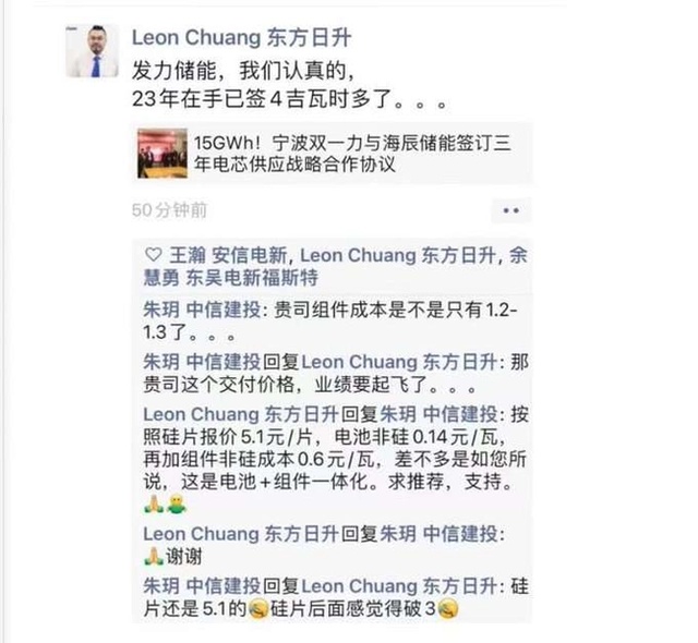 对此,1月12日,东方日升发布澄清公告,公司表示,公司关注到有媒体发布“又见光伏圈奇事:东方日升高管朋友圈透露订单规模,卖方首席‘微信调研’”等相关报道。庄英宏在公司的职务为公司组件事业部全球市场总监,系公司中层管理人员。公司强调,庄英宏发布的相关言论均系其个人行为,不代表公司立场。